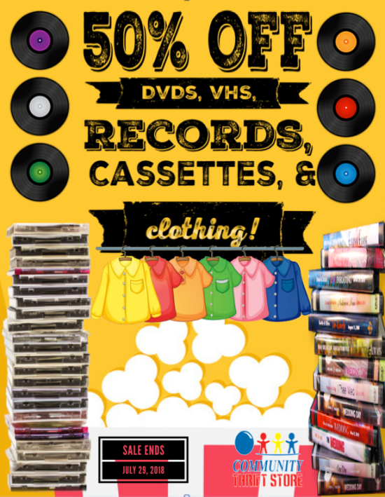 Movie night? Dance party? Fashion show? Whatever your plans this week, we have you covered! 50% off all DVDs, VHS, Records, Cassettes and Clothing!! Hurry in – sale ends July 29, 2018!