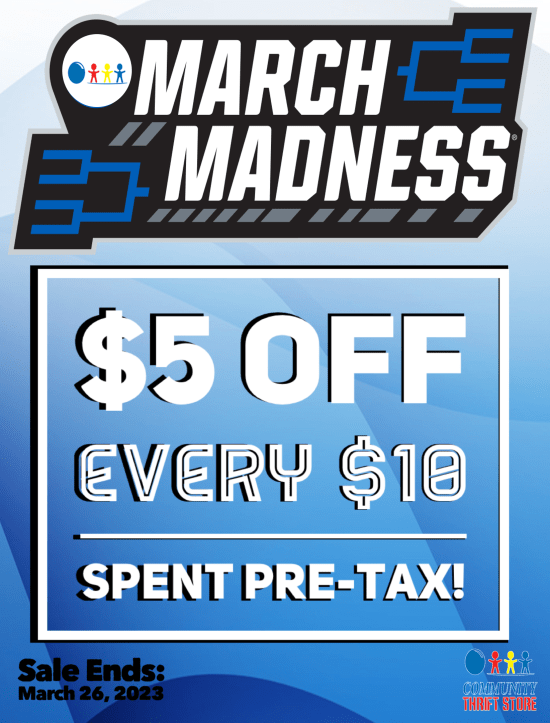 🥳 It’s March Madness!! 🤯 No, it’s not the basketball kind, but the 💰 save-you-lots-of-money kind! 💰 Come in this week and enjoy $5 OFF EVERY $10 SPENT pre-tax! Sale ends March 26, 2023.