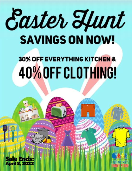 🐇 Shoppers, get your Easter baskets ready! 🐣 The Easter Hunt Savings are on! This week, save 30% OFF Everything Kitchen 🍽 & 40% OFF Clothing 👕! Hurry in, sale excludes new clothing with tags and ends April 8th, 2023.