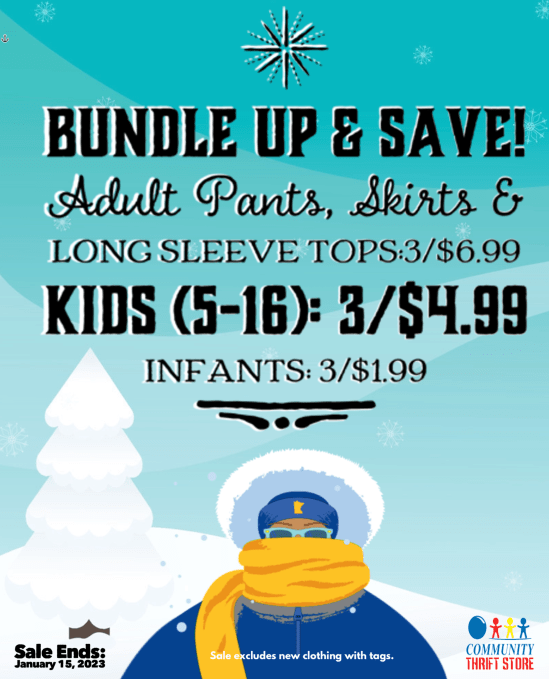 ❄️ Baby, it’s cold outside! ❄️ Bundle up & save with Community Thrift Store this week! Adult Pants, Skirts & Long-sleeve tops are 3/$6.99, Kids are just 3/$4.99 and Infants are 3/$1.99! With prices like that, we’re sure you’ll stay 🔥warm🔥 and so will your wallet – full of extra cash! Hurry in, sale excludes new clothing with tags and ends on January 15, 2023.