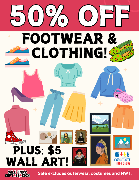 Get ready to 🍁fall🍂 into savings!! This week, take 50% OFF Footwear & Clothing! But wait – there’s more! Take advantage of our 🖼Wall Art BLOWOUT🖼 – each piece, just $5! Sale excludes outerwear, costumes and NWT and ends on September 22, 2024.💥