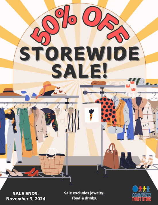 😲 Clothes, decor, treasures galore— 50% OFF *EVERYTHING* in store! 🎉 Hurry, don’t wait, before it’s too late! Grab your finds and celebrate! 🛒💥 Sale excludes food and beverage items, and ends on October 6th, 2024!